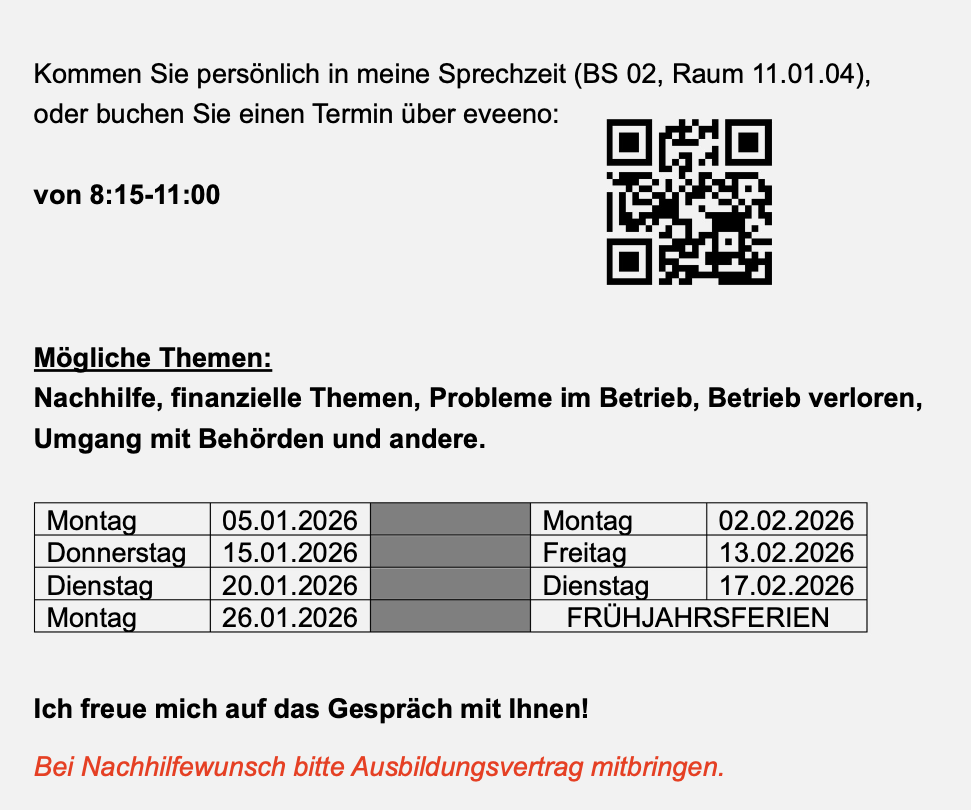 oder kommen Sie während der Sprechzeit in der Schule vorbei (Aushang an Raum 11.01.04)