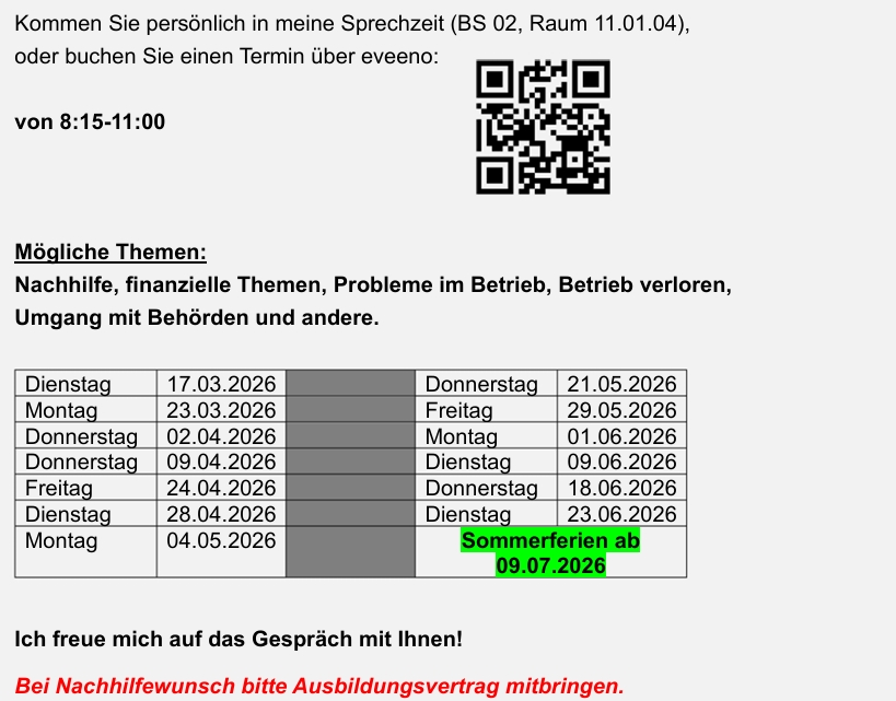 oder kommen Sie während der Sprechzeit in der Schule vorbei (Aushang an Raum 11.01.04)